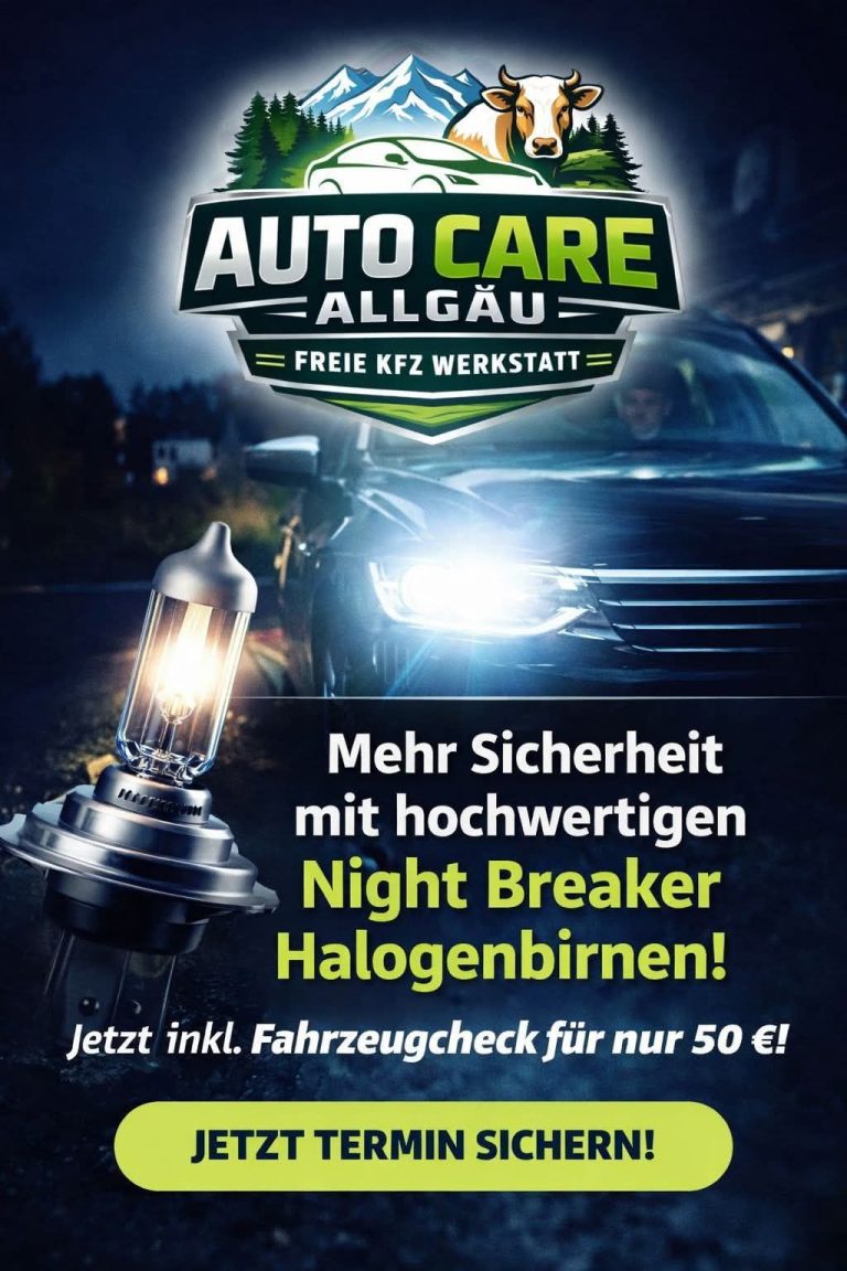 Mehr Sicherheit bei Nacht: Wir verbauen hochwertige Night Breaker Halogenbirnen inkl. kostenlosem Fahrzeugcheck für nur 50 €. Der fachgerechte Einbau erfolgt direkt durch den Kfz-Meister in unserer Werkstatt.